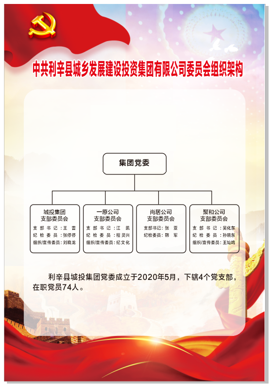 中共太阳成集团tyc33455委员会成立于2020年5月,下辖中共太阳成集团tyc33455支部委员会(太阳成集团tyc33455集团支部)、中共安徽一原建设有限公司支部委员会(一原支部)、中共利辛县尚居公司党支部(尚居支部)、中共利辛县聚和物业管理有限公司支部委员会(聚和支部),共有党员79人,其中预备党员6人。