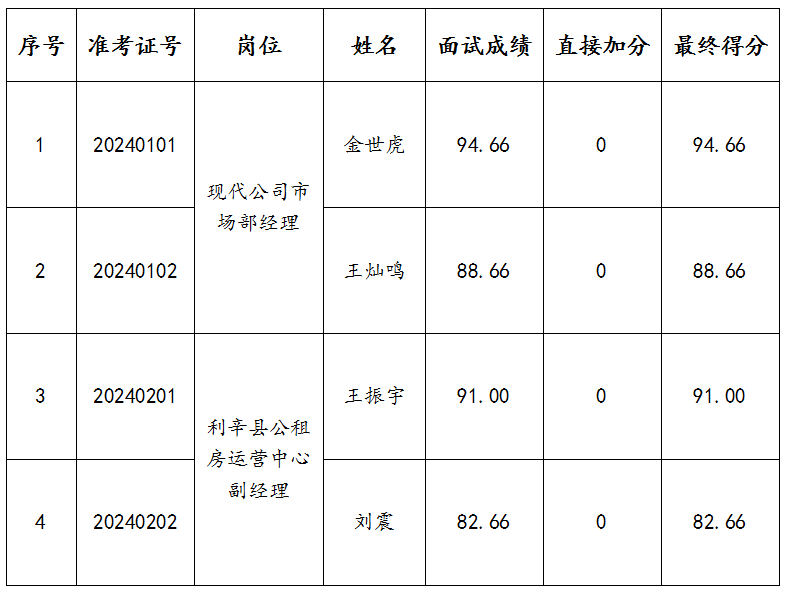 参照《太阳成集团tyc33455中层管理人员选拔任用工作实施办法》有关规定,2024年12月16日利辛县现代农业发展有限公司及其子公司就2024年度中层管理岗位开展内部竞聘工作,现将面试成绩公示如下: